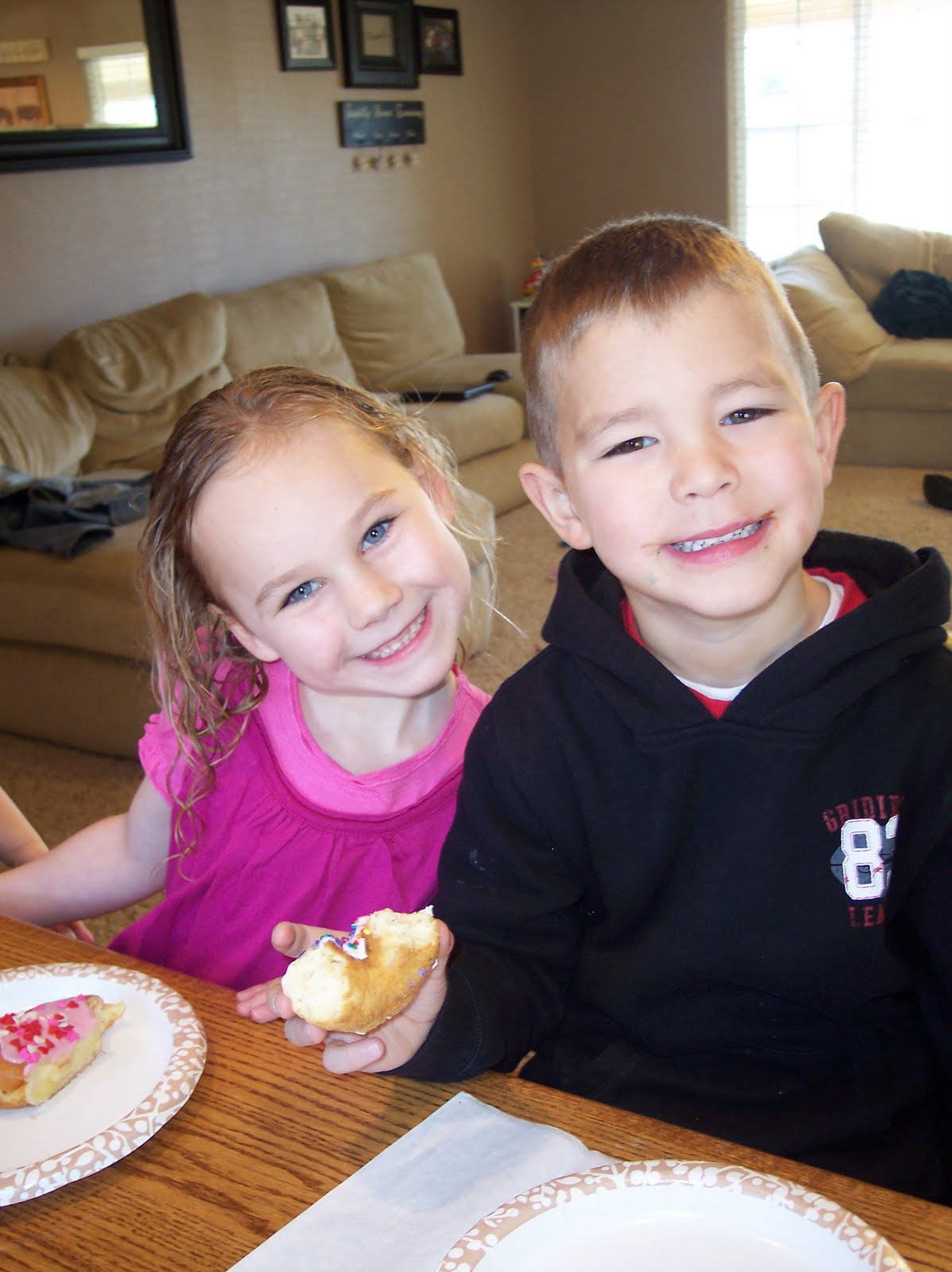 Jessi is 5!!! She had so much fun on her birthday. We started out with french toast for breakfast, then she got to open two of her presents. Then we hopped in the shower to get ready for our busy day. When we got out, we had a little suprise. Her friend Tyson showed up with a HEART shaped donut from Krispie Kreme. After playing a while with the kids. We started getting ready for her party. We had 12 kids (what was I thinking?) show up for the party. It was a HELLO KITTY party, complete with the cake. It was a stretch for MOM to decorate her cake, but we managed and it turned out okay. Then we finished up the day at FAMOUS DAVES. It was Jessi's pick for dinner. She kept asking if we had told the waitress that it was her birthday. Finally she got sang the loudest Happy Birthday song ever and the gave her a HUGE Ice Cream Sundae. She could not help but have a perma grin after that. She was pretty much spoiled rotten, but she deserves it. She is such a sweetheart and helps mom all day long. I always catch her unloading the dishwasher or changing out loads of laundry. She has such a happy helpful spirit. I don't know what I am going to do when she goes to school in August. I hope her little sister is watching and taking notes so she can help out too. :)